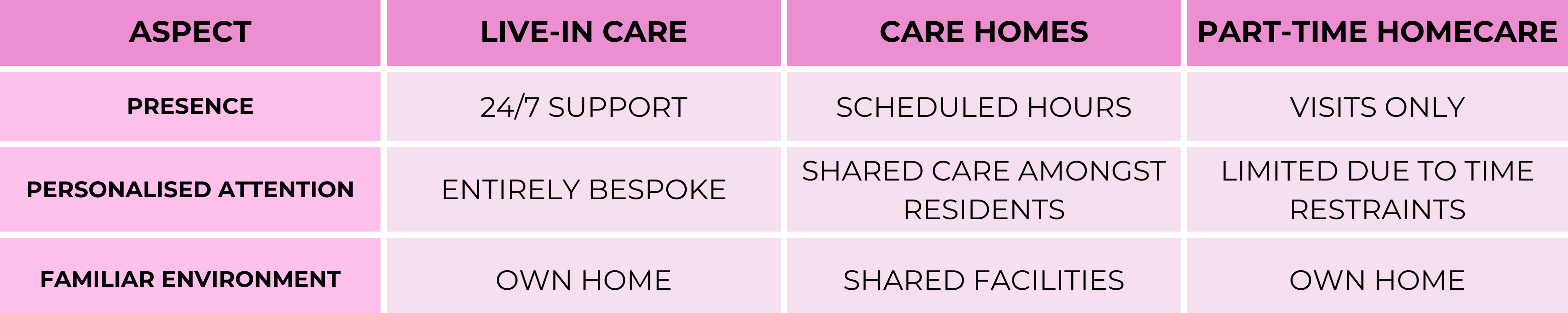 When considering care options, the choices can feel overwhelming. Unlike care homes or part-time assistance, live-in care provides an unmatched level of personalisation and continuity. Let’s compare: