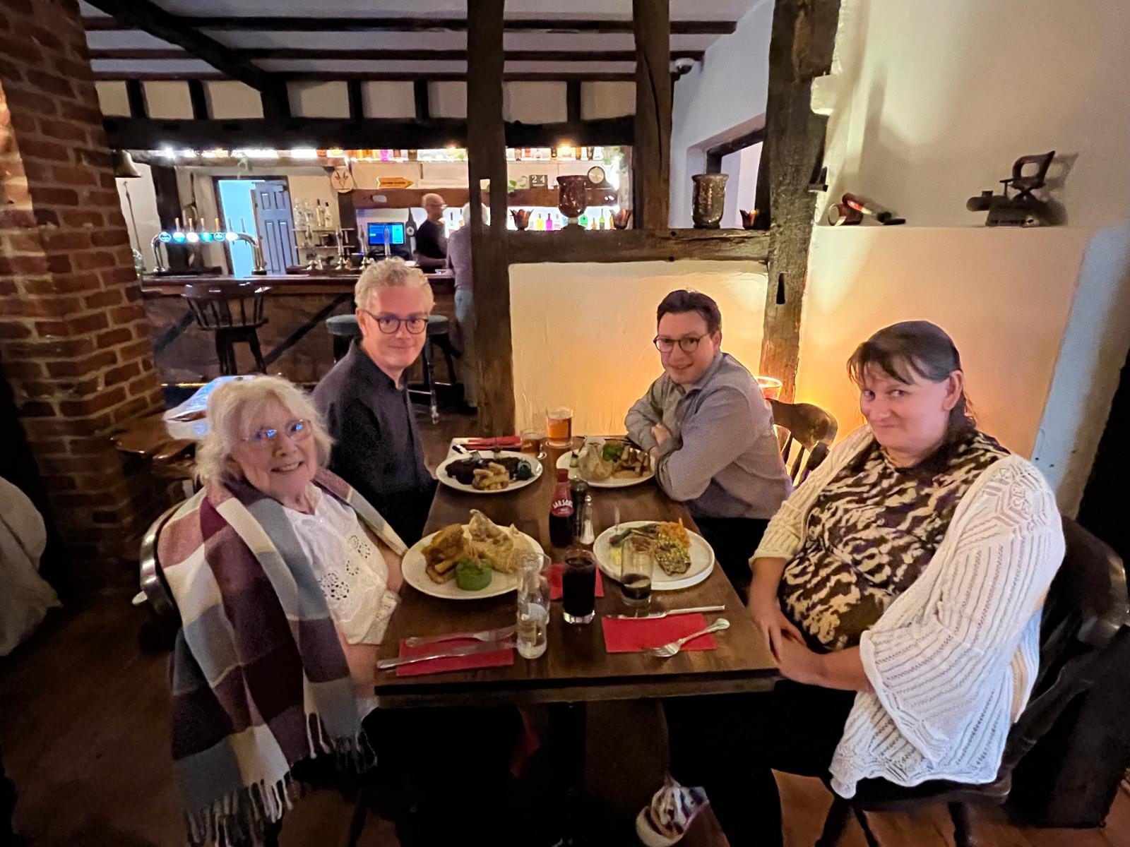 A photo of Pat, sharing a lovely meal with her family and carer, Jean. 🍴 Pat said, “Jean is a breath of fresh air. She’s like a daughter to me.”